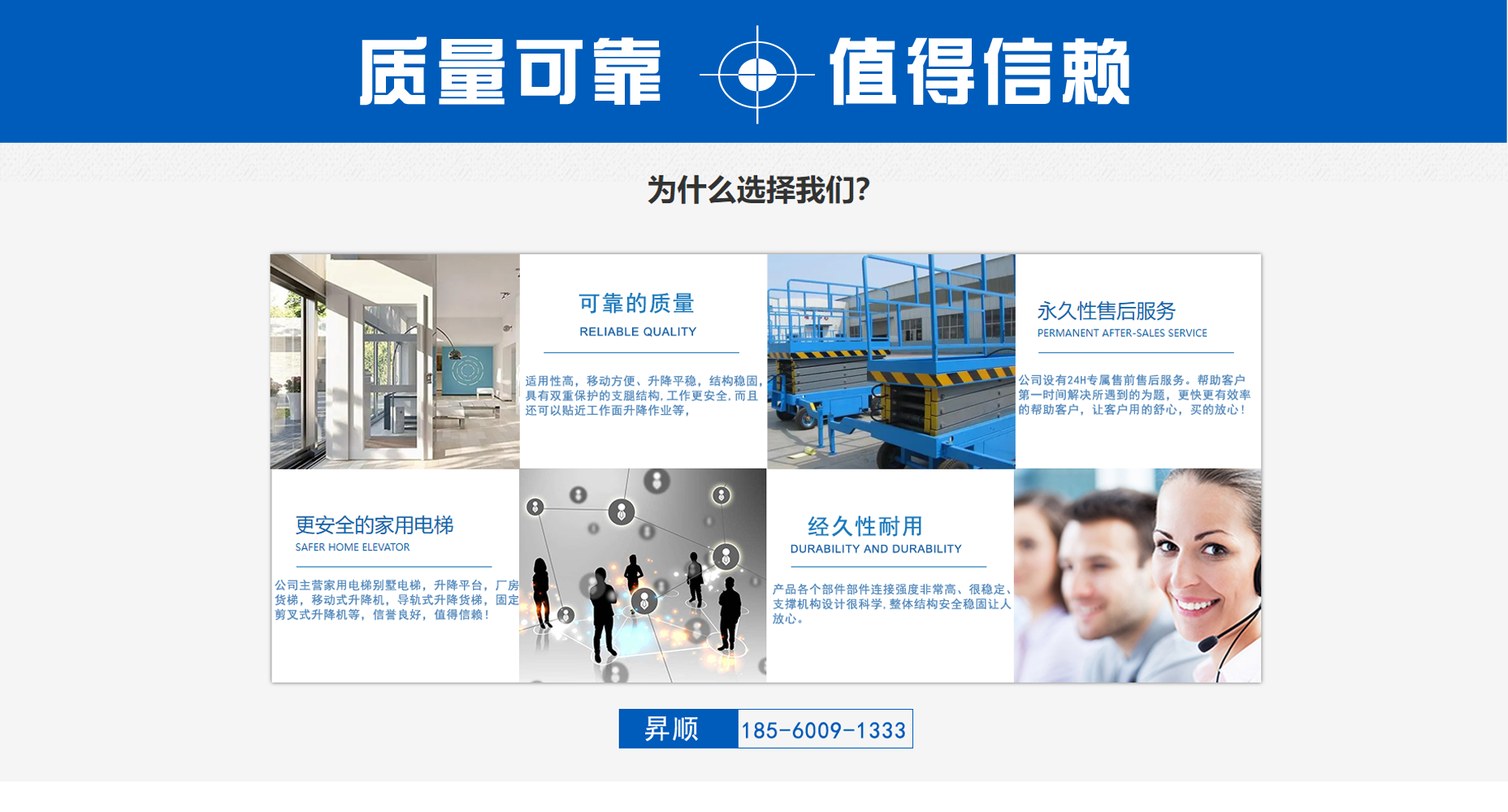 山東昇順液壓升降機械有限公司是一家主營家用電梯,別墅電梯,升降平臺,廠房貨梯,移動式升降機,導軌式升降貨梯,固定剪叉式升降機等產品企業(yè),質量可靠,值得信賴。 用戶至上,以用戶為中心”是公司永遠堅持的服務宗旨,贏得用戶的贊許是我們的榮譽,及時滿足用戶的需求,是我們公司的愿望。長期以來,公司員工以優(yōu)質的服務,取悅于用戶,以誠信的言行取信于用戶,得到了用戶們的好評。我們期待著與您更加愉快的合作!公司的發(fā)展,離不開社會的大力支持,在社會的支持和幫助下,我們正昂首闊步邁向未來! 我們的經營方針是:以質量求生存,以產品求發(fā)展,以信譽保合作,以服務贏客戶。 本公司對產品質量和各項服務恪守合同承諾,并愿與新老客戶精誠合作,共創(chuàng)未來。 公司精神:創(chuàng)新是主題,超越是不懈的追求。 公司宗旨:信譽保證,誠信為本。 我們會以合理的價格,良好的信譽,雄厚的實力,優(yōu)質的產品,最周到的服務,服務于廣大新老客戶!...